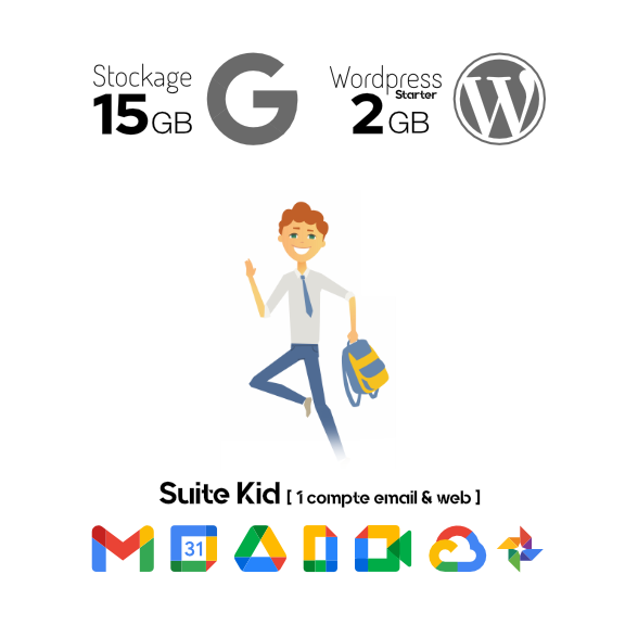 - Un compte Google Workspace incluant un email personalisé @robin.fr sur la plateforme Gmail. Stockages (15Gb, 30Gb, 150Gb ou 500Gb)